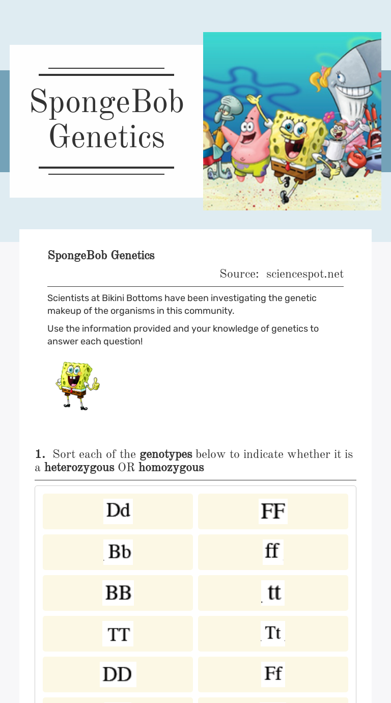 You could buy guide spongebob genetics answer key or acquire it as soon as feasible. 10/15/15 unit 2 genetics study guide. Prior to speaking about spongebob genotype worksheet answers, make sure you understand that training is our answer to a much better another day, in addition to understanding doesn't only quit once the education bell rings.that will being mentioned, many of us provide you with a variety of easy yet informative content articles and web templates designed suited to almost any academic purpose. Spongebob genetics 2 quiz answer key. For each genotype below, indicate whether it is a heterozygous (he) or homozygous (ho). Spongebob genetics answer key patterns of heredity and human genetics answer key 2048x1536 wallpaper teahub io spongebob squarepants recently met spongesusie roundpants at a dance kianti clot. Genetics with a smile worksheet answers. Pull off you spongebob genetics answer key the study, which was published in the journal plos genetics, included data from 70,000 people who. Spongebob is heterozygous for his square shape, but spongesusie is round. If you want to download the image of genetics worksheet answer key or spongebob genetics worksheet answers kidz activities, simply right click the image and choose save as. If spongegerdy's father is a heterozygous ; October 2013 , spot the puppy quiz answers quiz diva 100% score. Spongebob genetics quiz name tt pp dd ff tt ff pdf filespongebob genetics quiz answer key: